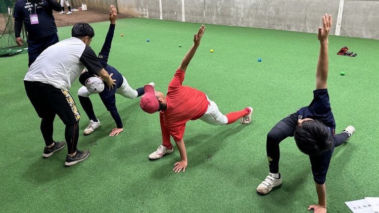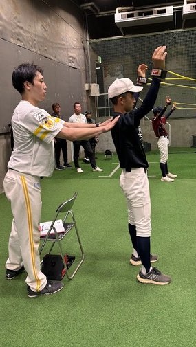 その後は、キャッチボールを行い、参加者を2人グループに分けてローテーション形式で投球指導とトレーニングを行いました。